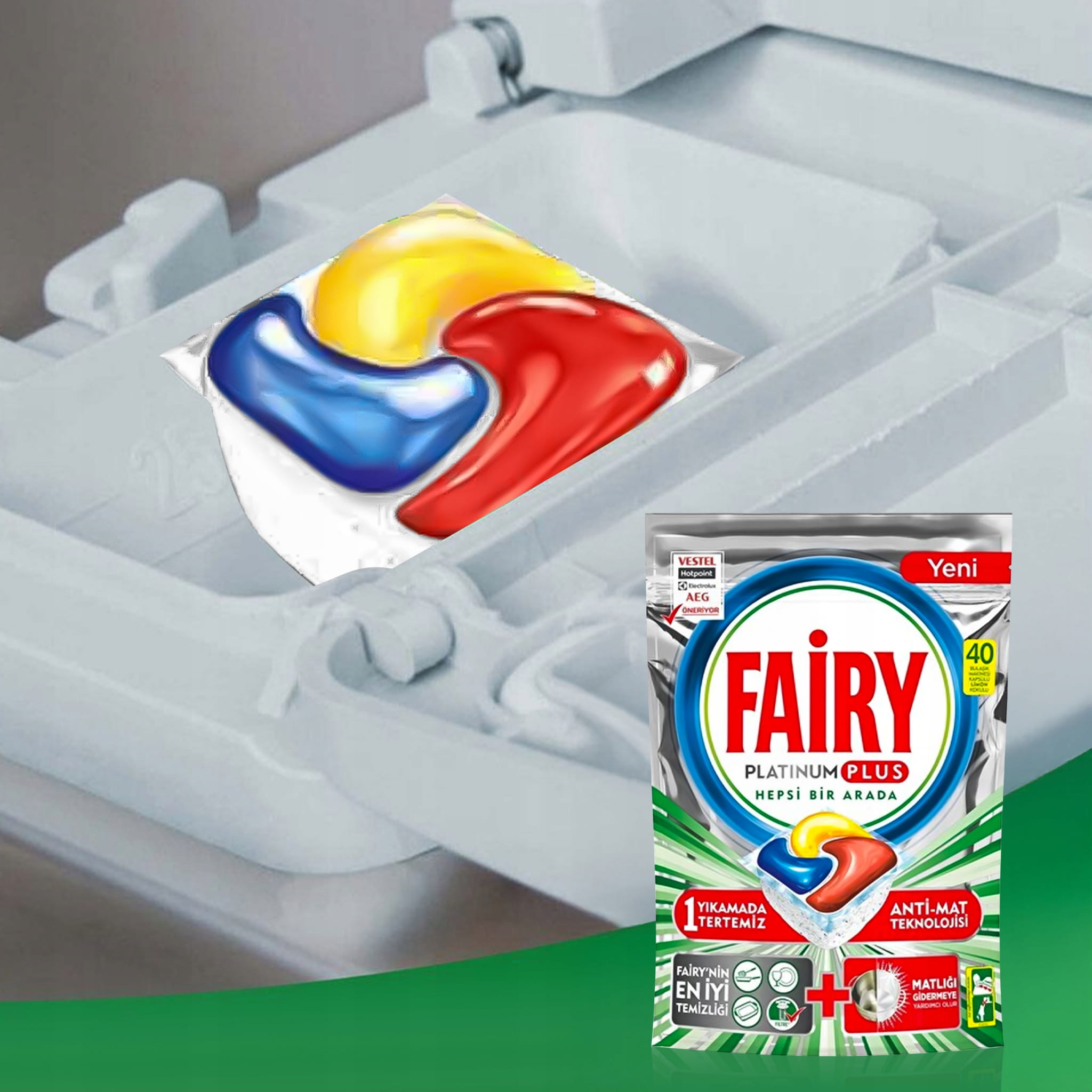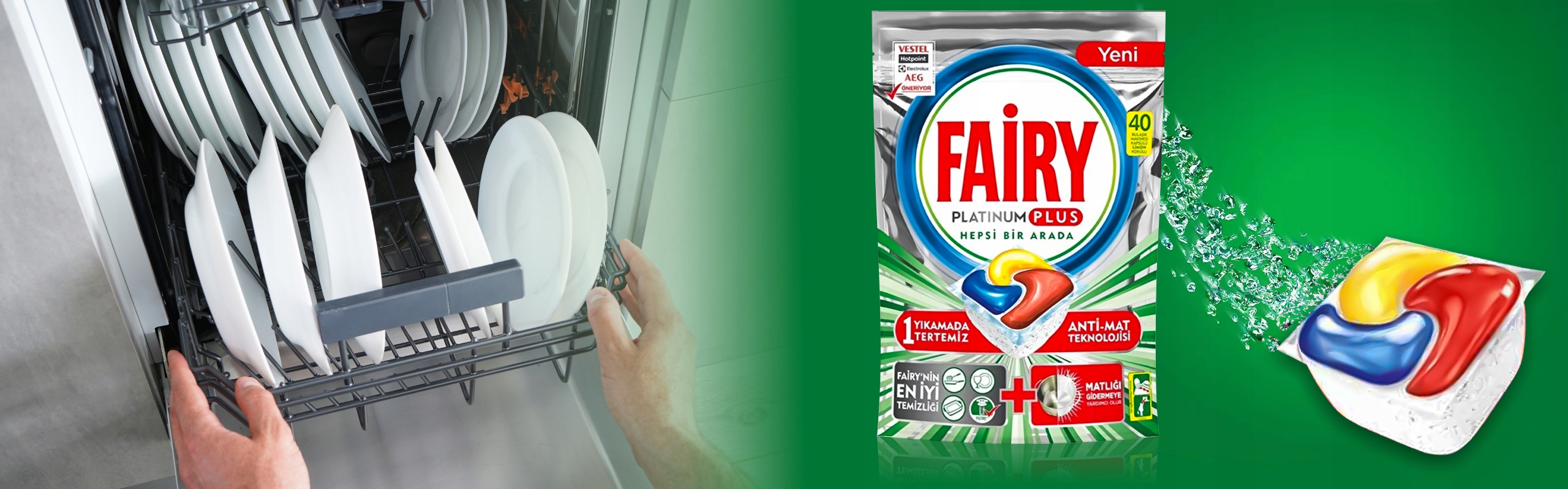 - Fairy Platinum nie tylko myje naczynia, ale również czyści zmywarkę, usuwając tłuszcz i zanieczyszczenia, które mogą gromadzić się we wnętrzu zmywarki