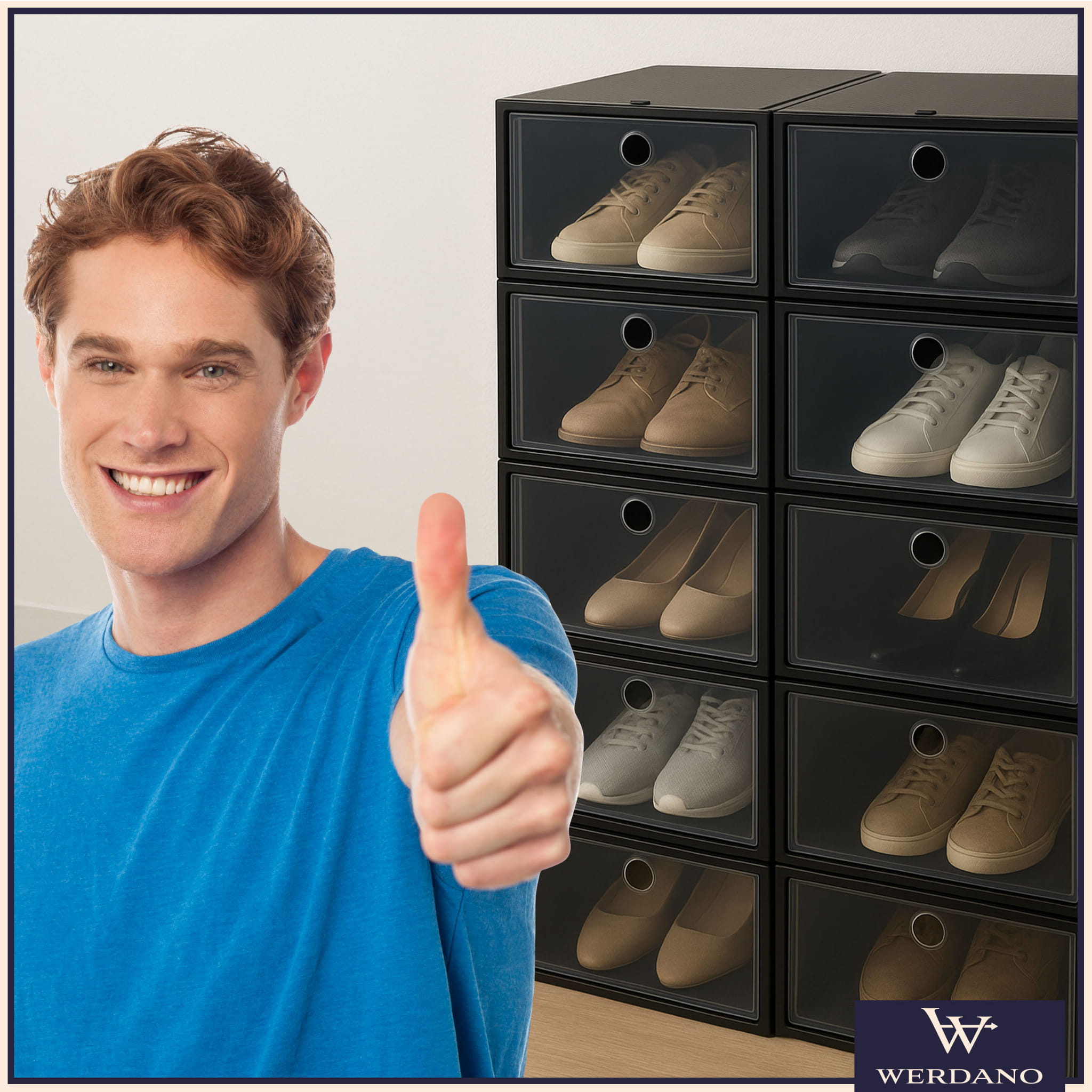 Przezroczysty front sprawia, że każda para jest dobrze widoczna – koniec z szukaniem właściwych butów w porannym pośpiechu. Pojemniki są łatwe w obsłudze, otwierają się wygodnymi drzwiczkami i można je piętrować, tworząc stabilną mini-szafkę na buty. To nowoczesne, praktyczne i eleganckie rozwiązanie, które sprawdzi się w każdym wnętrzu.