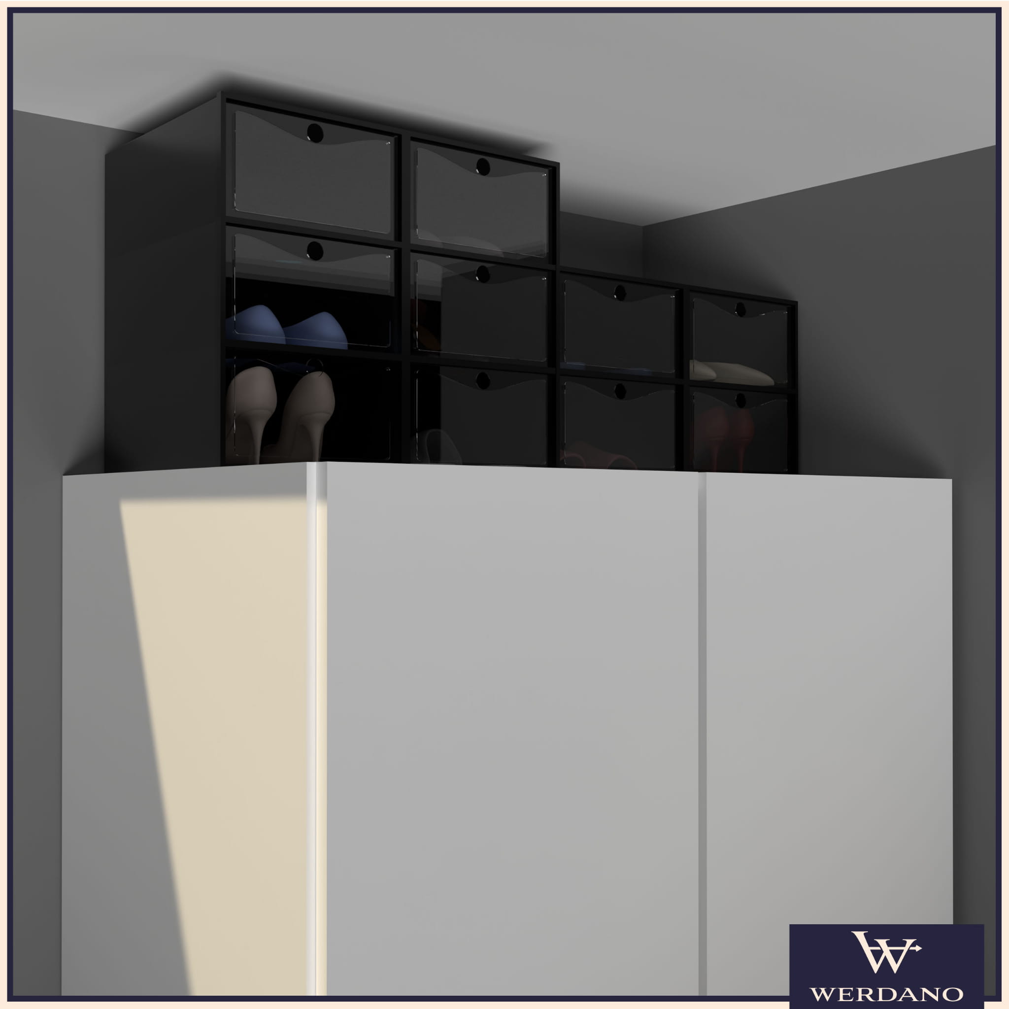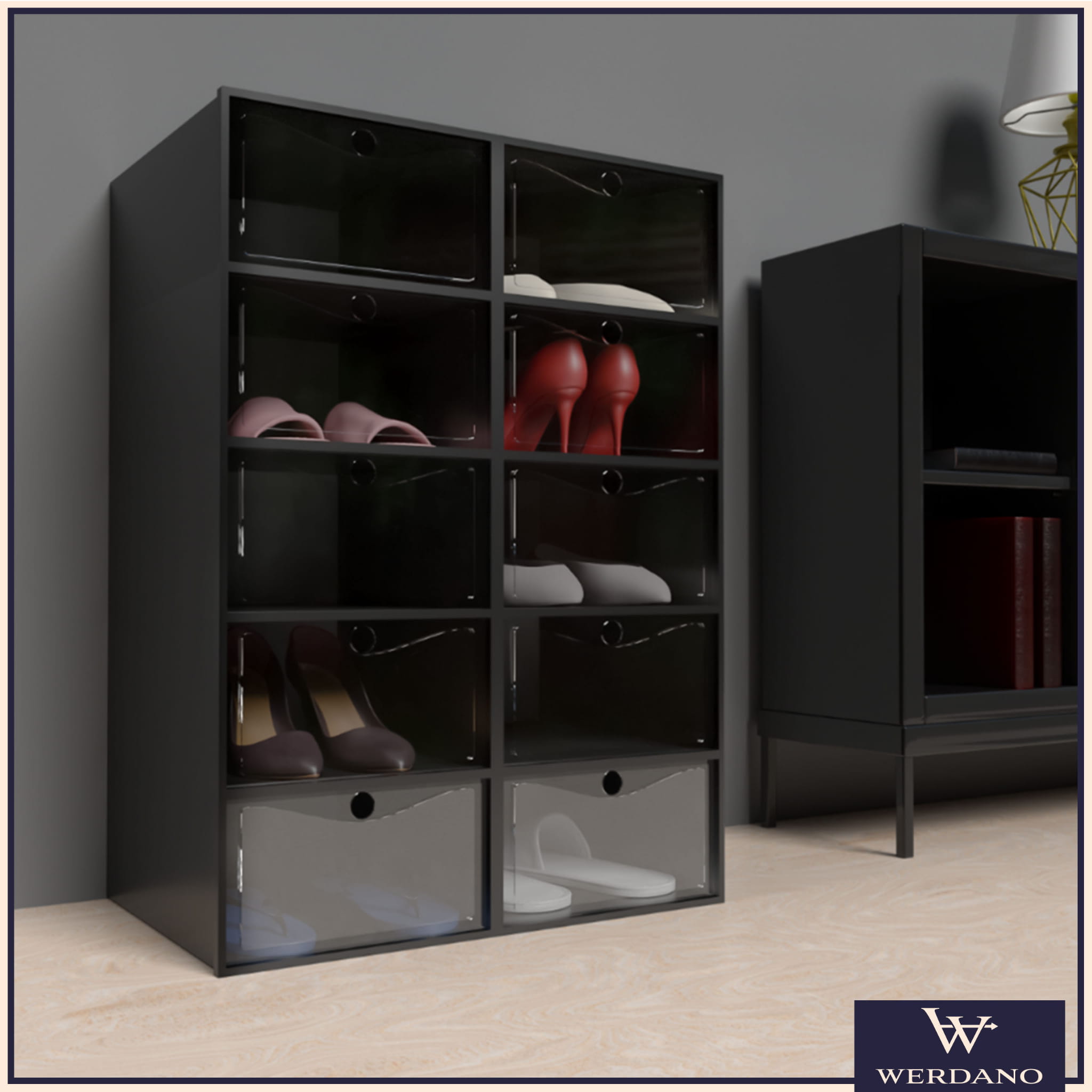 Dzięki transparentnym drzwiczkom już z daleka widzisz, jakie buty znajdują się w środku. Koniec z szukaniem odpowiedniej pary w pośpiechu – teraz wystarczy jeden rzut oka.