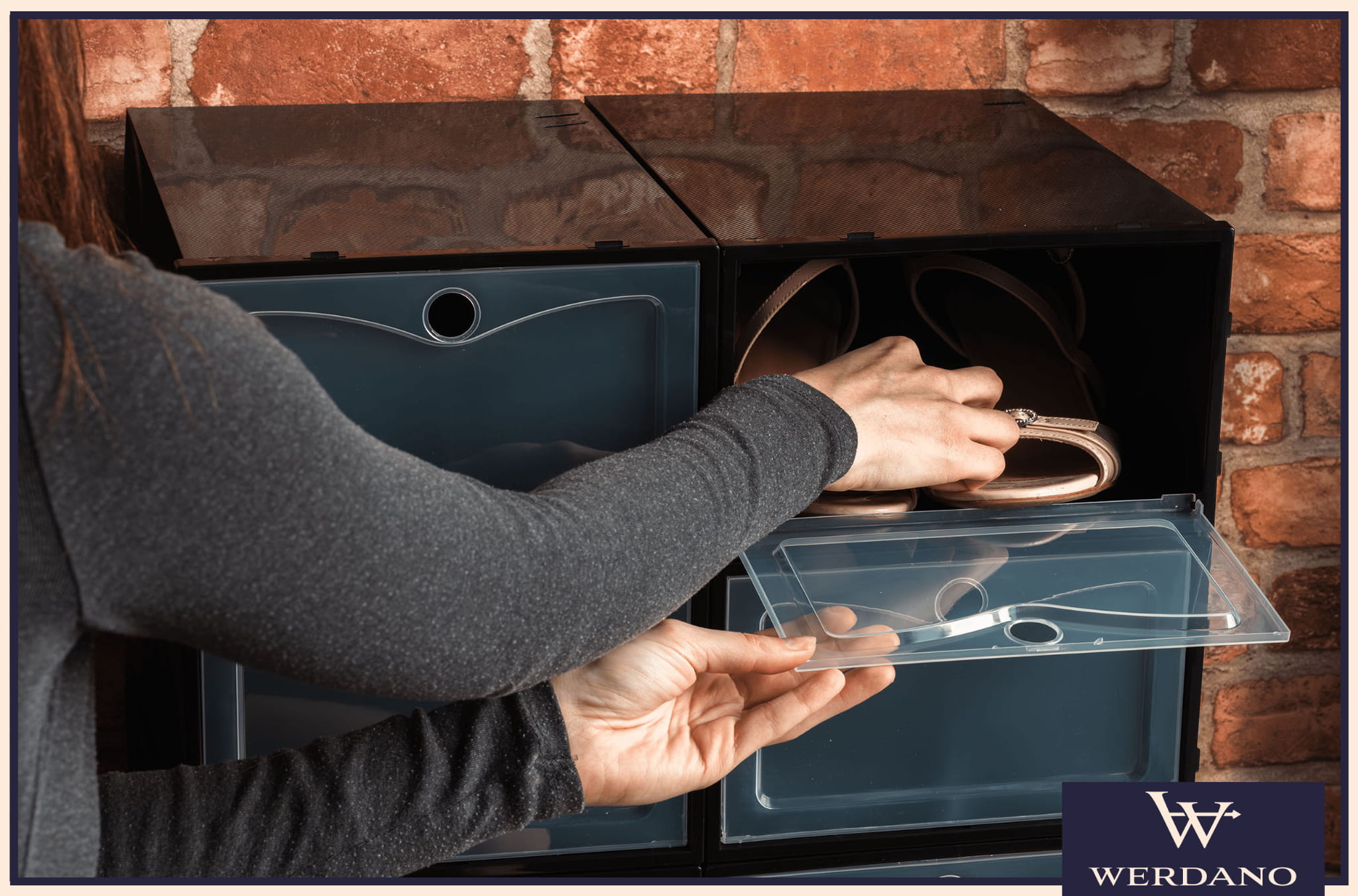 Każdy pojemnik wyposażony jest w praktyczne drzwiczki z okrągłym uchwytem. Nie musisz wyciągać całego pudełka – wystarczy lekko pociągnąć, aby sięgnąć po buty. To szczególnie przydatne, gdy pojemniki są ułożone jeden na drugim.