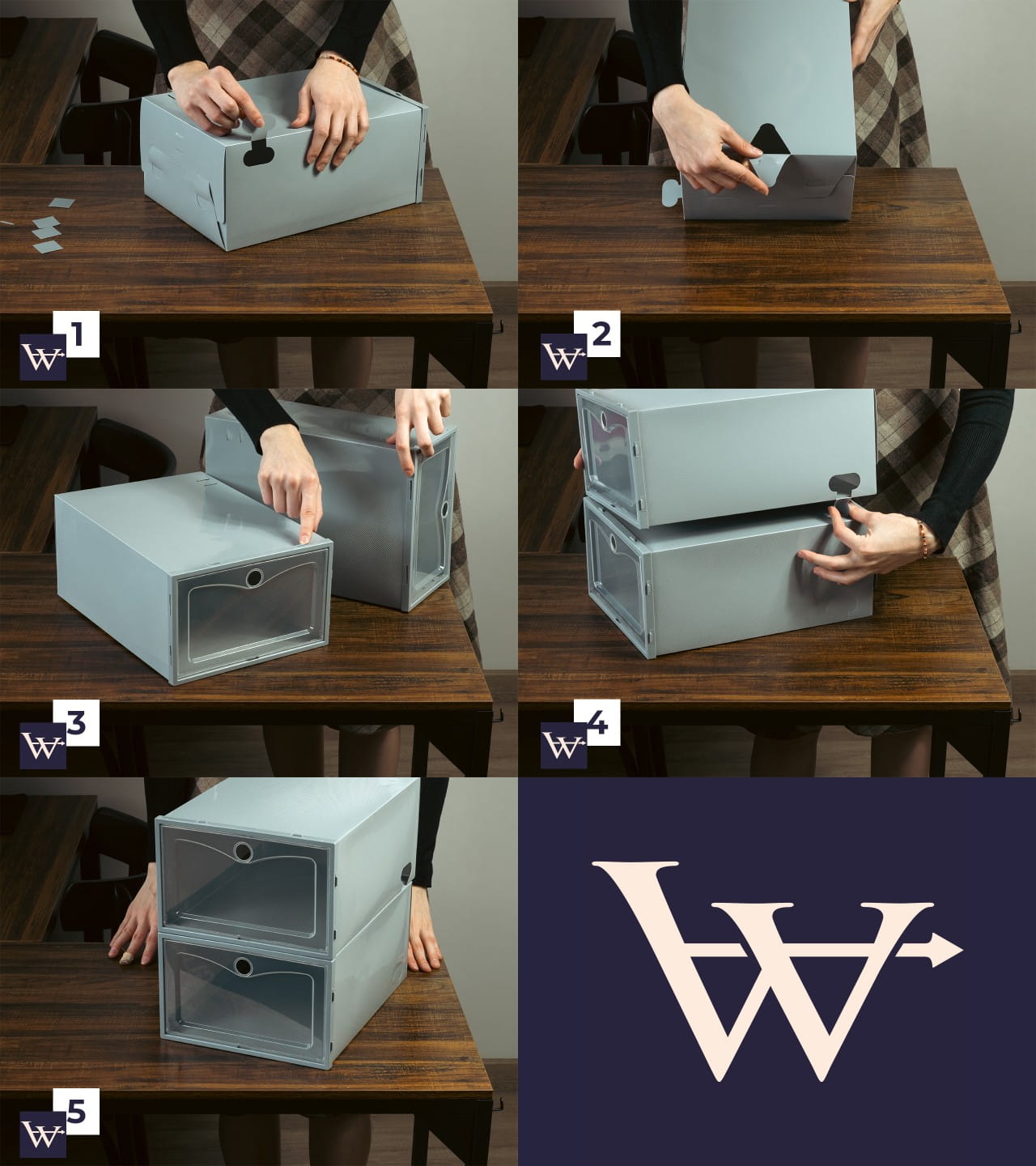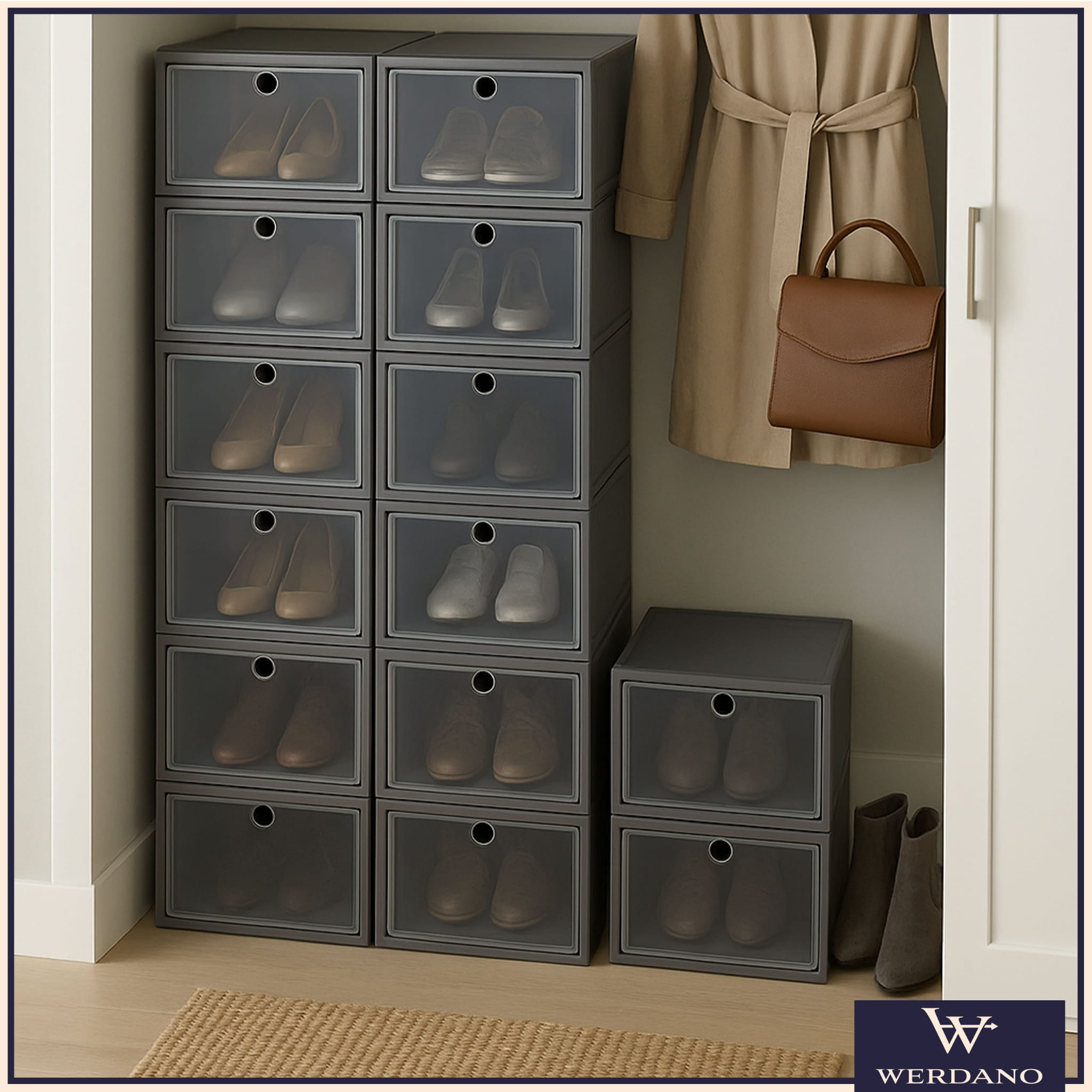 Przezroczysty front sprawia, że każda para jest dobrze widoczna – koniec z szukaniem właściwych butów w porannym pośpiechu. Pojemniki są łatwe w obsłudze, otwierają się wygodnymi drzwiczkami i można je piętrować, tworząc stabilną mini-szafkę na buty. To nowoczesne, praktyczne i eleganckie rozwiązanie, które sprawdzi się w każdym wnętrzu.