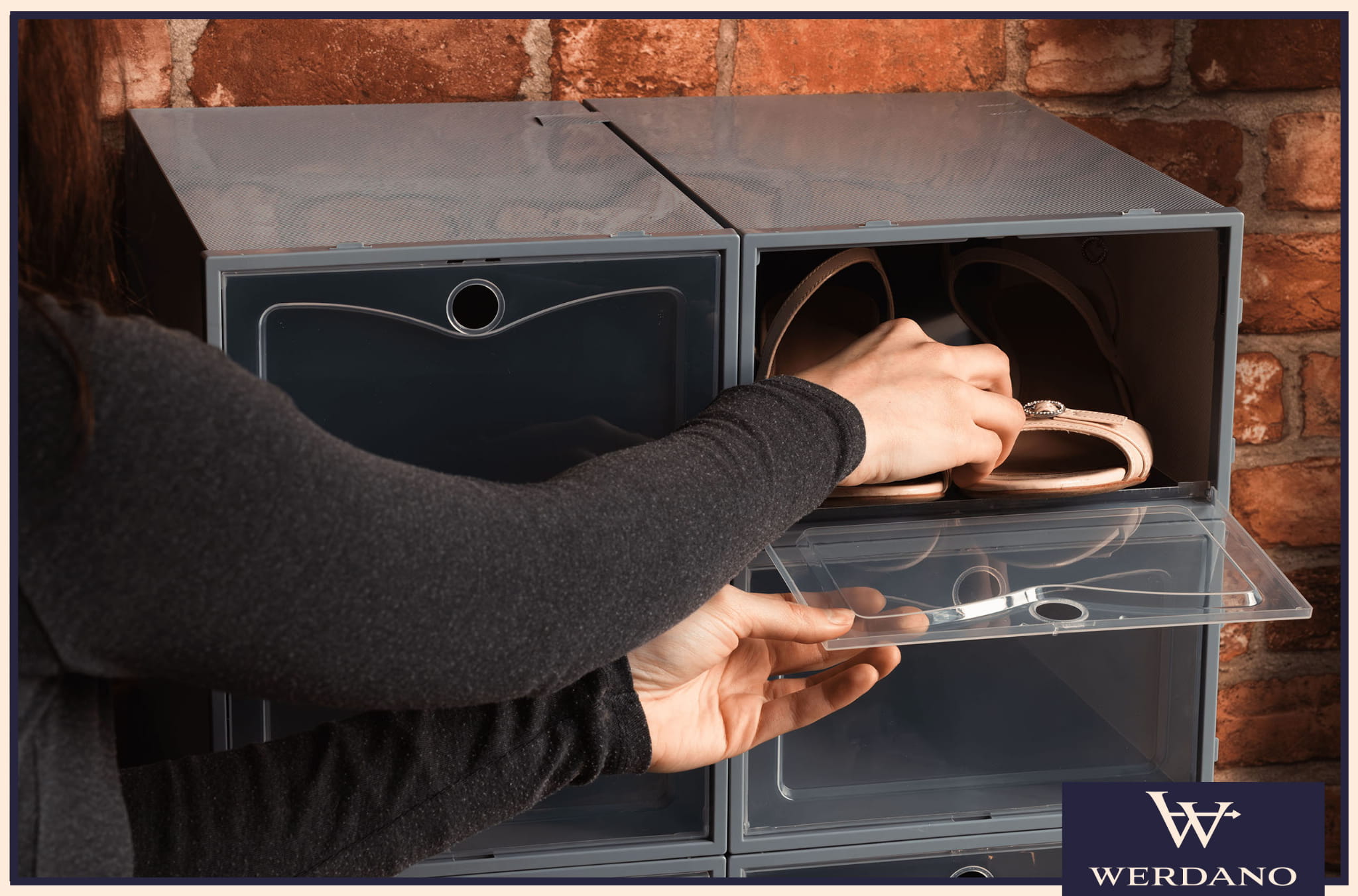 Każdy pojemnik wyposażony jest w praktyczne drzwiczki z okrągłym uchwytem. Nie musisz wyciągać całego pudełka – wystarczy lekko pociągnąć, aby sięgnąć po buty. To szczególnie przydatne, gdy pojemniki są ułożone jeden na drugim.