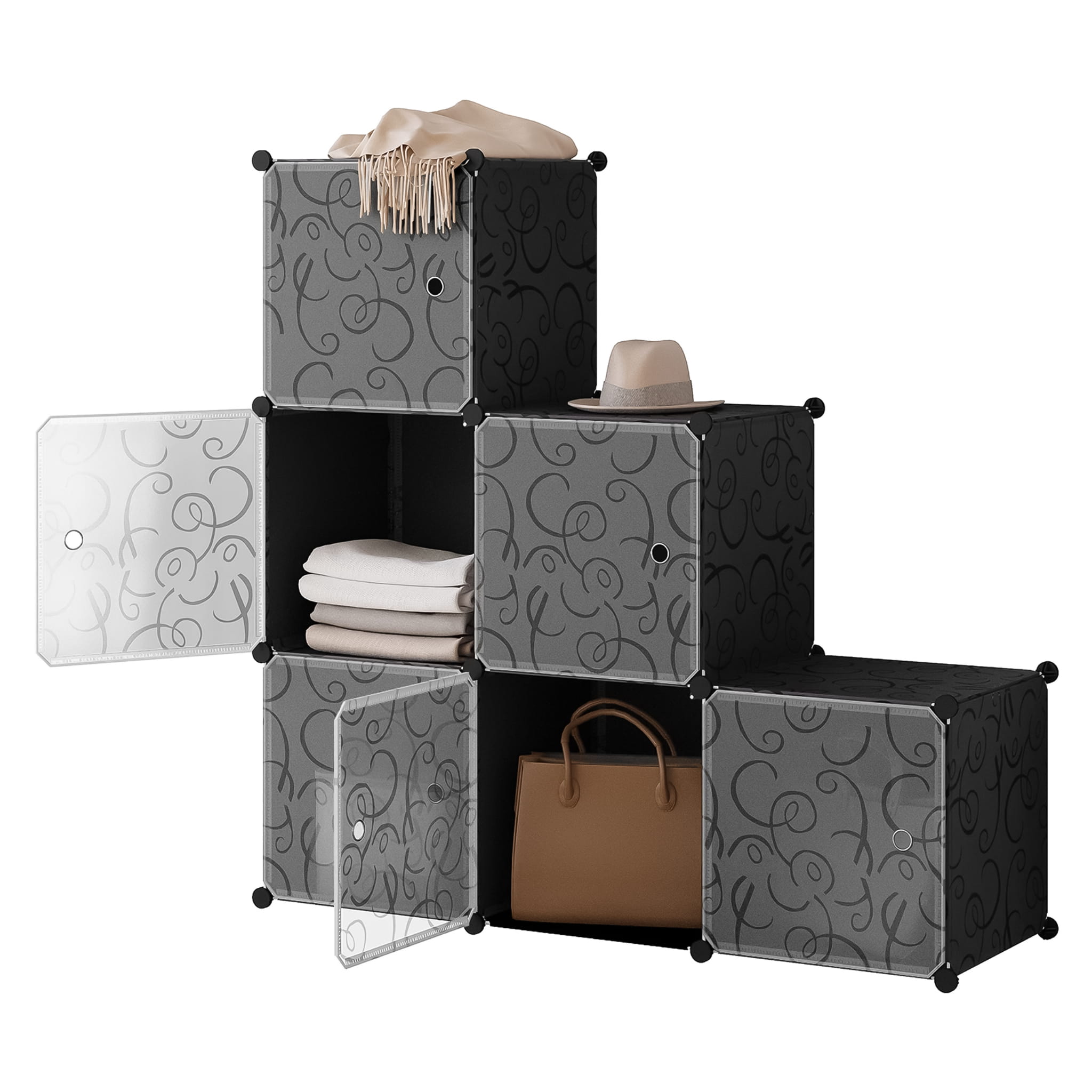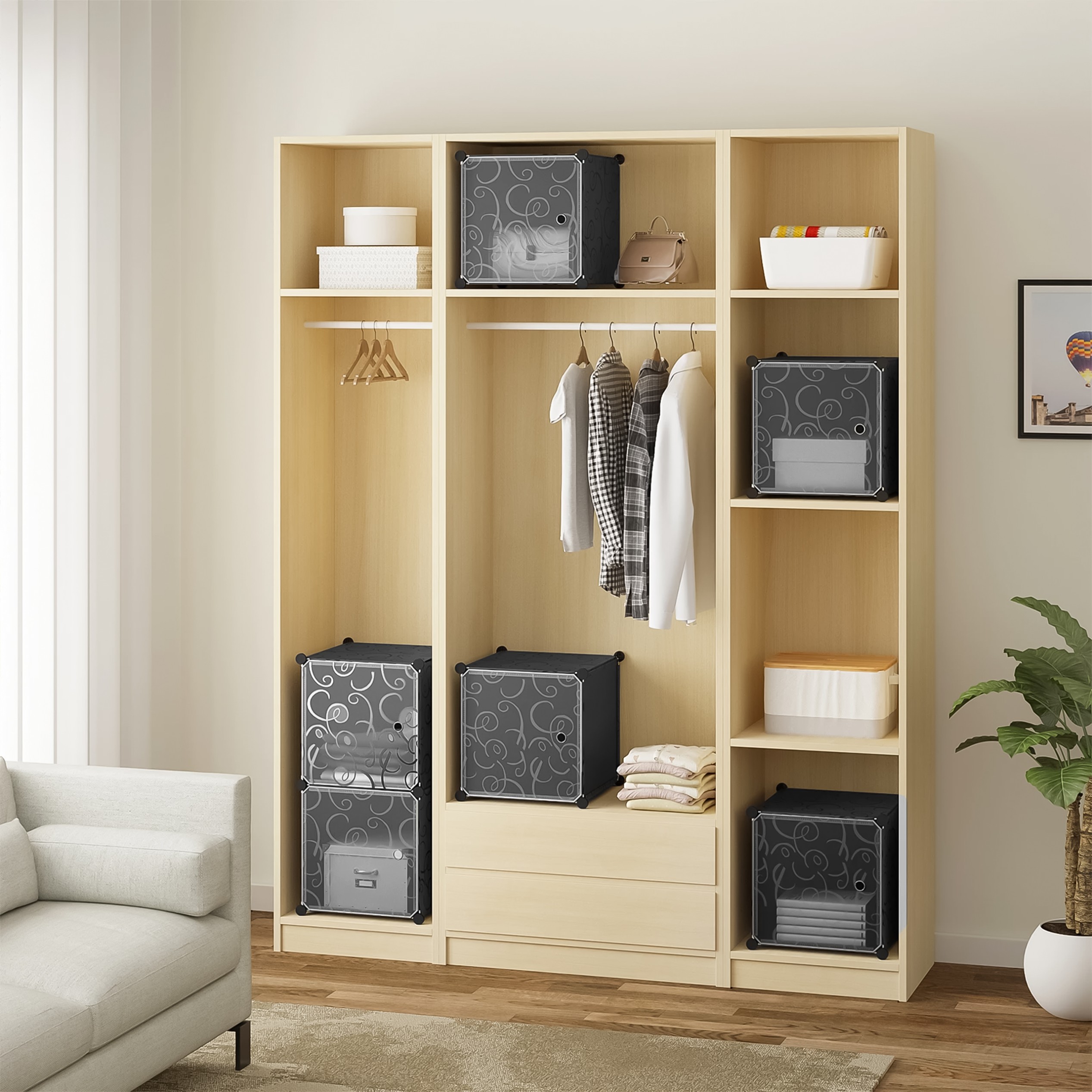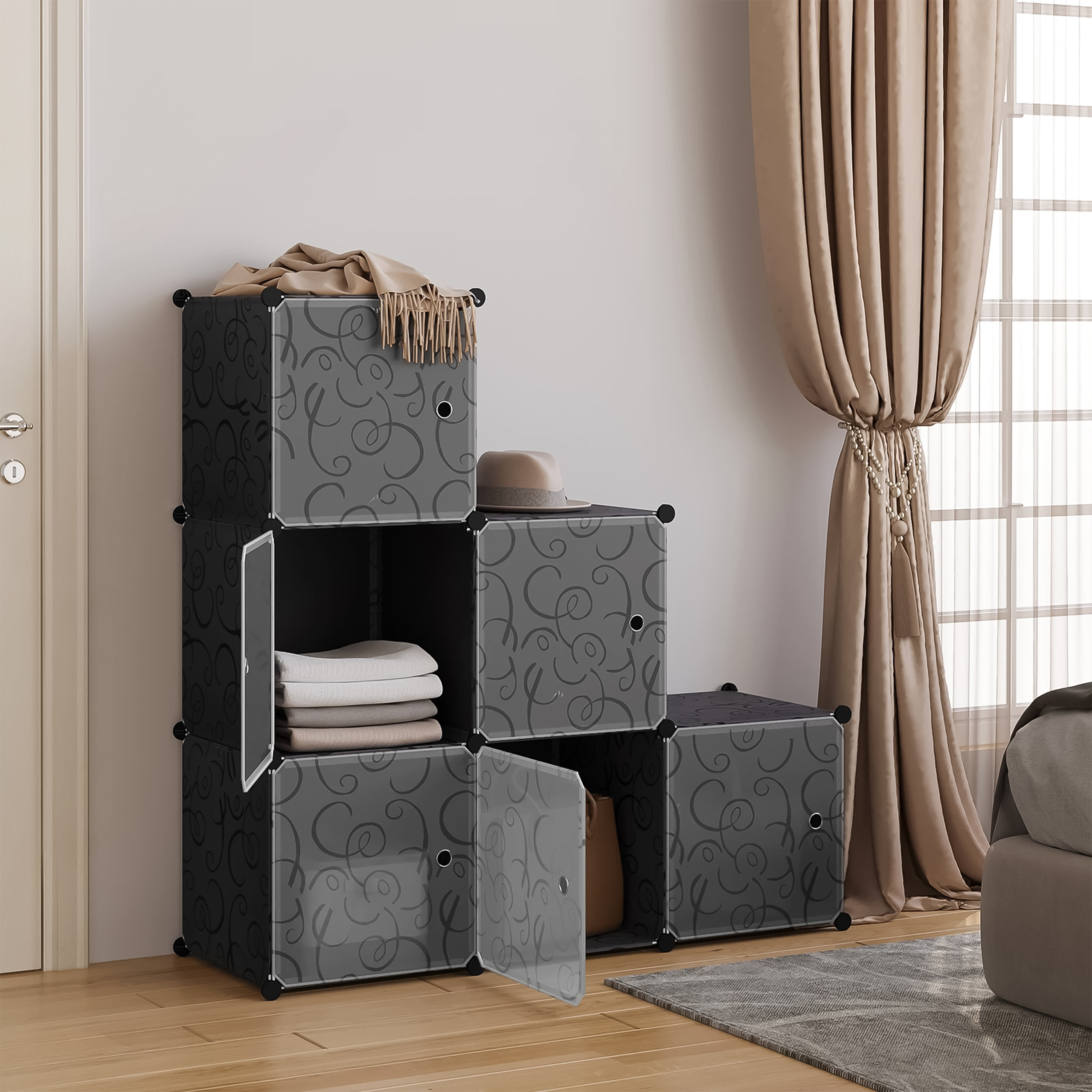Szafka składa się z trzech pojemnych modułów, które można ustawiać w pionie, w poziomie lub w różnych konfiguracjach – dopasowując ich układ do dostępnej przestrzeni. Każdy moduł posiada drzwiczki otwierane na bok, co ułatwia dostęp do zawartości i jednocześnie pozwala oszczędzić miejsce w pomieszczeniu.